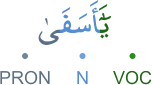 [WLY] [] [GWL] [Y] [ÆSF] [] [] [BYŽ] [AYN] [] [ḪZN] [] [KƵM] WTWL ANHM WGÆL YÆ ǼSF AL YWSF WÆBYŽT AYNÆH MN ÆLḪZN FHW KƵYM ve tevellā ǎnhum ve ḳāle yā esefā ǎlā yūsufe vebyeDDet ǎynāhu mine l-Huzni fe huve keZīmun وتولى عنهم وقال يا أسفى على يوسف وابيضت عيناه من الحزن فهو كظيم [و ل ي] [] [ق و ل] [ي] [ا س ف] [] [] [ب ي ض] [ع ي ن] [] [ح ز ن] [] [ك ظ م]