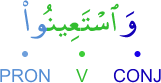 [AWN] [ṦBR] [ṦLW] [] [KBR] [] [] [ḢŞA] WÆSTAYNWÆ BÆLṦBR WÆLṦLÆT WÎNHÆ LKBYRT ÎLÆ AL ÆLḢÆŞAYN vesteǐynū biS-Sabri ve SSalāti ve innehā lekebīratun illā ǎlā l-ḣāşiǐyne واستعينوا بالصبر والصلاة وإنها لكبيرة إلا على الخاشعين [ع و ن] [ص ب ر] [ص ل و] [] [ك ب ر] [] [] [خ ش ع]