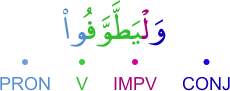 [] [GŽY] [TFS̃] [WFY] [NZ̃R] [ŦWF] [BYT] [ATG] S̃M LYGŽWÆ TFS̃HM WLYWFWÆ NZ̃WRHM WLYŦWFWÆ BÆLBYT ÆLATYG ṧumme lyeḳDū tefeṧehum velyūfū nuƶūrahum velyeTTavvefū bil-beyti l-ǎtīḳi ثم ليقضوا تفثهم وليوفوا نذورهم وليطوفوا بالبيت العتيق [] [ق ض ي] [ت ف ث] [و ف ي] [ن ذ ر] [ط و ف] [ب ي ت] [ع ت ق]