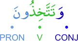 CONJ – prefixed conjunction wa (and) V – 2nd person masculine plural (form VIII) imperfect verb PRON – subject pronoun الواو عاطفة فعل مضارع والواو ضمير متصل في محل رفع فاعل