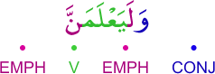 [ALM] [] [] [ÆMN] [ALM] [NFG] WLYALMN ÆLLH ÆLZ̃YN ËMNWÆ WLYALMN ÆLMNÆFGYN veleyeǎ'lemenne llahu elleƶīne āmenū veleyeǎ'lemenne l-munāfiḳīne وليعلمن الله الذين آمنوا وليعلمن المنافقين [ع ل م] [] [] [ا م ن] [ع ل م] [ن ف ق]