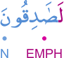 [] [] [HWD̃] [ḪRM] [KLL] [] [ƵFR] [] [BGR] [ĞNM] [ḪRM] [] [ŞḪM] [] [] [ḪML] [ƵHR] [] [ḪWY] [] [] [ḢLŦ] [AƵM] [] [CZY] [BĞY] [] [ṦD̃G] WAL ÆLZ̃YN HÆD̃WÆ ḪRMNÆ KL Z̃Y ƵFR WMN ÆLBGR WÆLĞNM ḪRMNÆ ALYHM ŞḪWMHMÆ ÎLÆ MÆ ḪMLT ƵHWRHMÆ ǼW ÆLḪWÆYÆ ǼW MÆ ÆḢTLŦ BAƵM Z̃LK CZYNÆHM BBĞYHM WÎNÆ LṦÆD̃GWN ve ǎlā elleƶīne hādū Harramnā kulle ƶī Zufurin ve mine l-beḳari velğanemi Harramnā ǎleyhim şuHūmehumā illā mā Hamelet Zuhūruhumā evi l-Havāyā ev mā ḣteleTa biǎZmin ƶālike cezeynāhum bibeğyihim ve innā leSādiḳūne وعلى الذين هادوا حرمنا كل ذي ظفر ومن البقر والغنم حرمنا عليهم شحومهما إلا ما حملت ظهورهما أو الحوايا أو ما اختلط بعظم ذلك جزيناهم ببغيهم وإنا لصادقون [] [] [ه و د] [ح ر م] [ك ل ل] [] [ظ ف ر] [] [ب ق ر] [غ ن م] [ح ر م] [] [ش ح م] [] [] [ح م ل] [ظ ه ر] [] [ح و ي] [] [] [خ ل ط] [ع ظ م] [] [ج ز ي] [ب غ ي] [] [ص د ق]