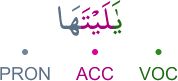 VOC – prefixed vocative particle ya ACC – accusative particle PRON – 3rd person feminine singular object pronoun أداة نداء حرف نصب من اخوات «ان» و«ها» ضمير متصل في محل نصب اسم «ليت»