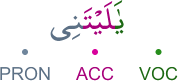 VOC – prefixed vocative particle ya ACC – accusative particle PRON – 1st person singular object pronoun أداة نداء حرف نصب من اخوات «ان» والياء ضمير متصل في محل نصب اسم «ليت»