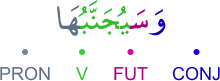 CONJ – prefixed conjunction wa (and) FUT – prefixed future particle sa V – 3rd person masculine singular (form II) passive imperfect verb PRON – 3rd person feminine singular object pronoun الواو عاطفة حرف استقبال فعل مضارع مبني للمجهول و«ها» ضمير متصل في محل نصب مفعول به